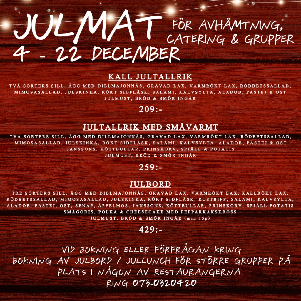 Vi på Restaurang Dálvvadis bjuder in till julfest fredag 8 & lördag 9 december där man som gäst först välkomnas med glögg & juliga snittar, innan man sätter sig till bords & avnjuter ett stort hemlagat julbord med en mix av klassiska och lokala anrättningar, som avslut dukas det fram ett gediget efterrättsbord med sötsaker, desserter, ostar, frukt med mera!